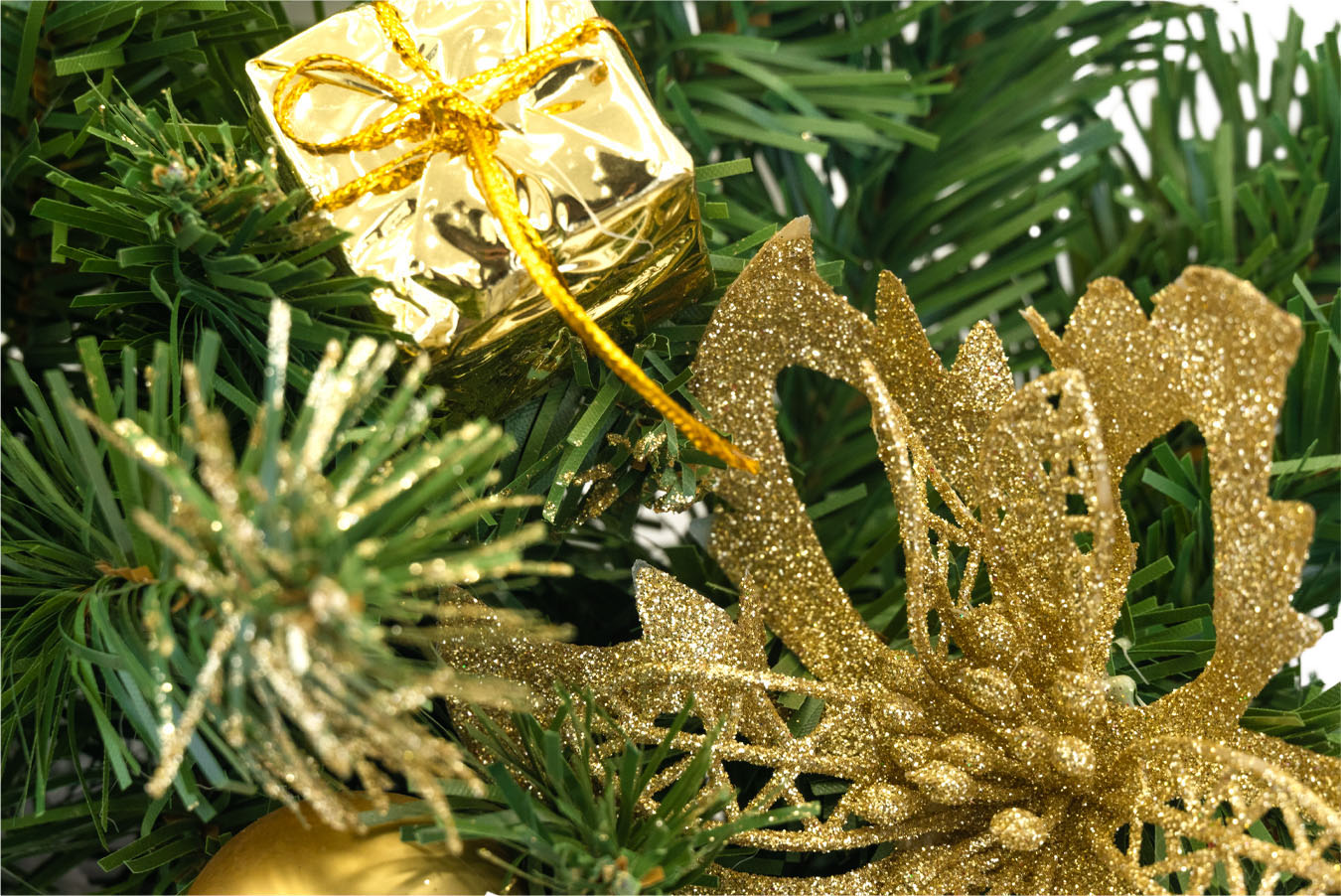 - Vánoční dekorace se zlatými doplňky ozdobami - zlaté mašle, zlaté perličky, zlaté ozdoby