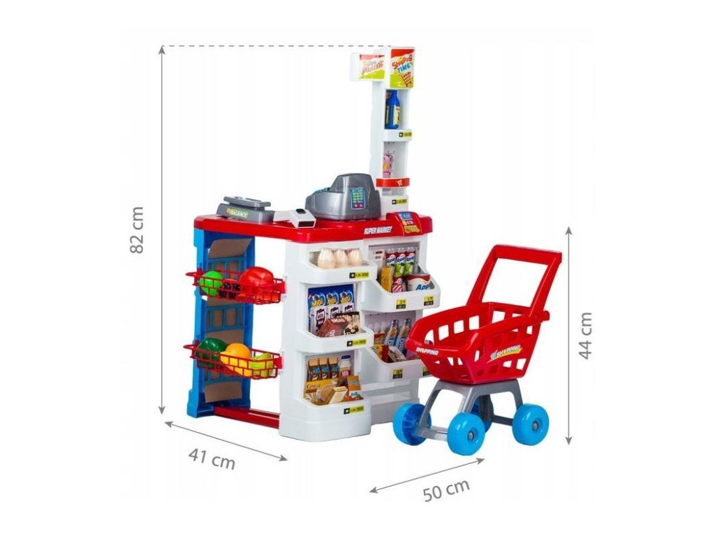 Zahrajte se s dětmi na obchodníky s vlastním supermarketem! Dětský supermarket obsahuje 24 prvků. Pokladnu, skener, závaží, nabídku ovoce (jablko, pomeranč, hrozny) a zeleniny (mrkev, paprika, kukuřice, karambola), trvanlivých potravin (vejce, kartony, plechovky, láhve) i papírové jmenovky.
