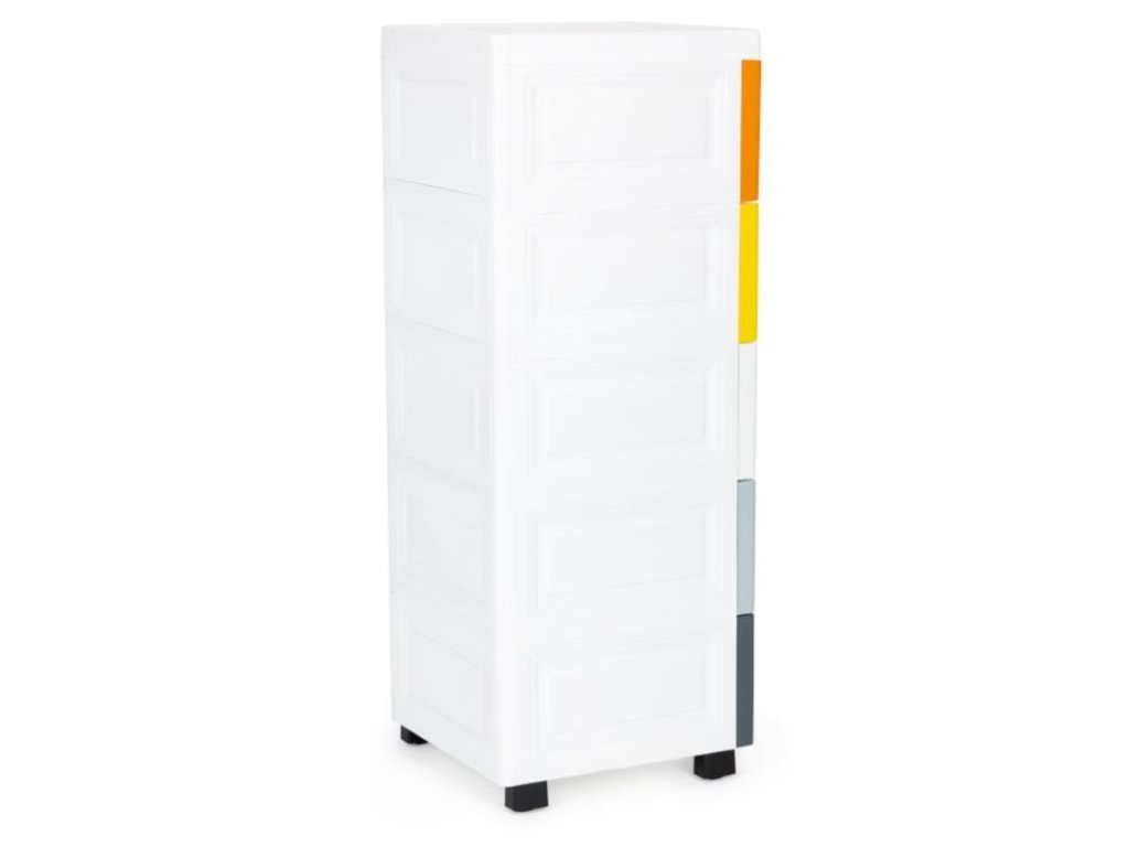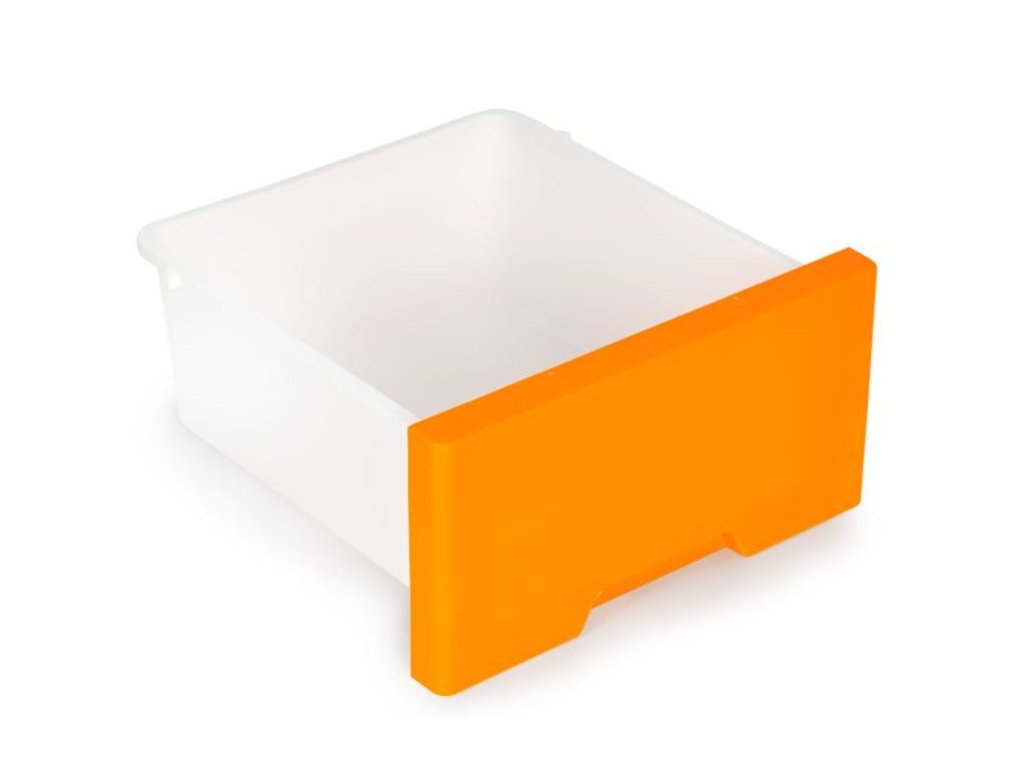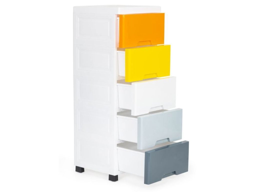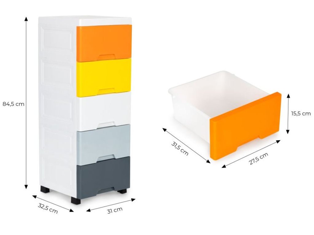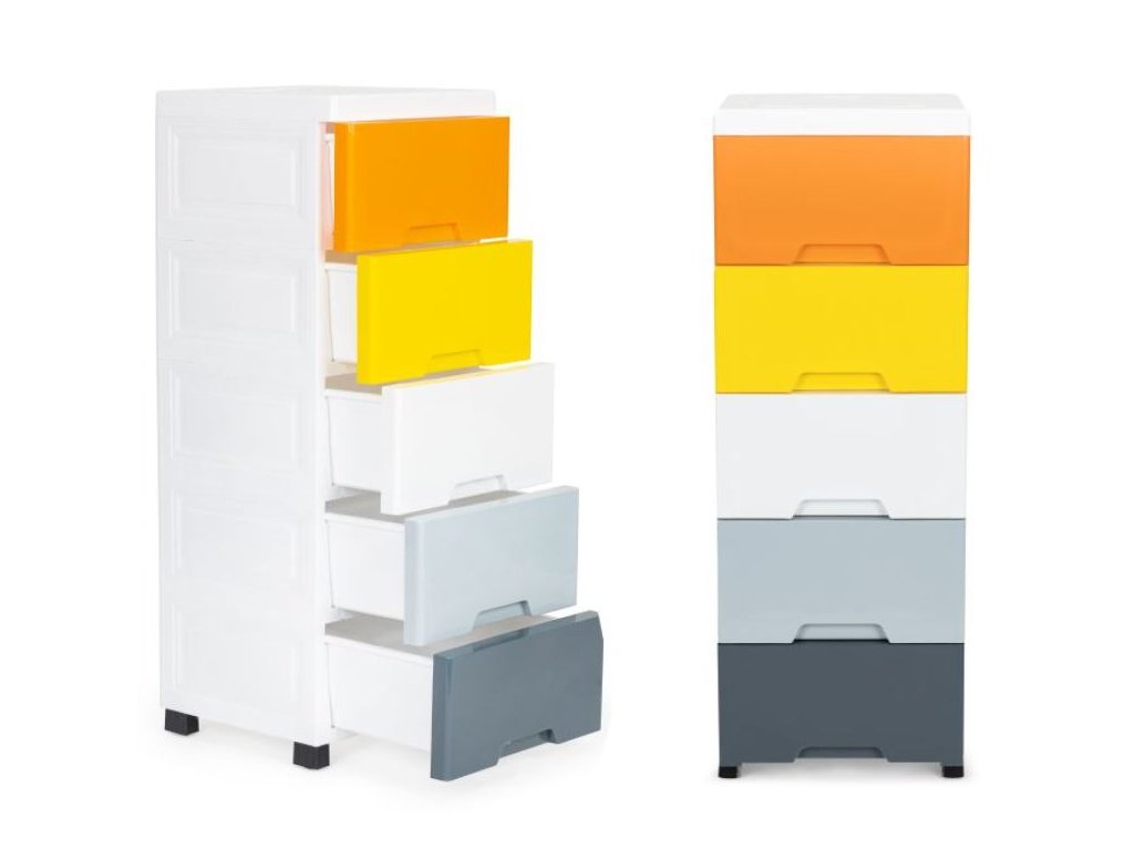 - Regál se skládá z pěti barevných zásuvek, se speciálně profilovanou rukojetí na přední straně, která usnadňuje jejich zasouvání a vysouvání.