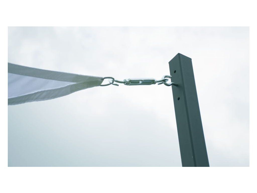 - Při montáži je třeba pamatovat na to, že každá plachta vyžaduje rezervu napětí. Mezi montážním bodem a nerezovým kroužkem umístěným v rohu plachty musí být umístěno napínací zařízení, které umožní správné napnutí plachty.