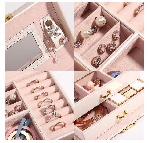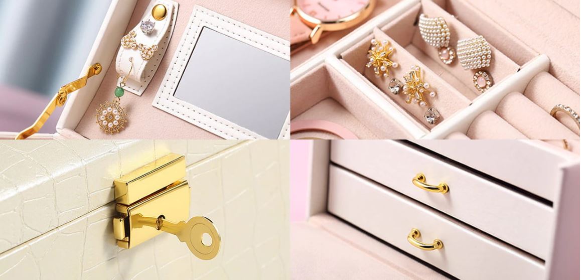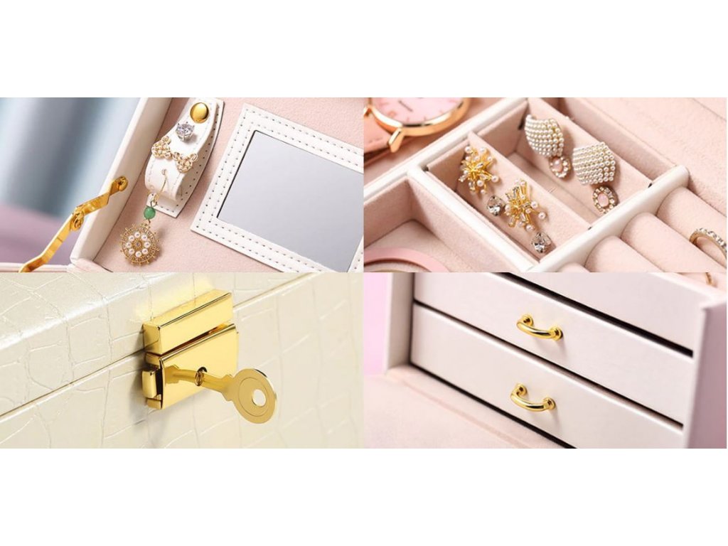 - Přihrádky jsou v různých velikostech a jsou ideální pro uložení hodinek, náramků, řetízků, náušnic a jiných drobností.