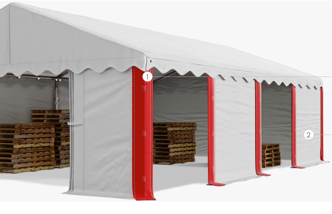 - Boční stěny s roletami – boční stěny jsou připevněny ke konstrukci každé 2m, na speciálních gumách. Každá stěna je vybavena síťovým oknem a roletou, která se navíjí. Roletu lze srolovat k zakrytí okna nebo srolovat a namontovat suchým zipem v horní části stěny.