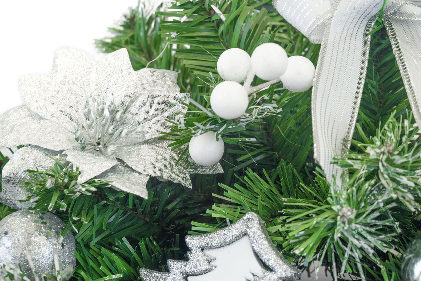 - Vánoční věnec je vyroben z umělého jehličí se stříbrnými doplňky, které dodají místnosti slavnostní nádech